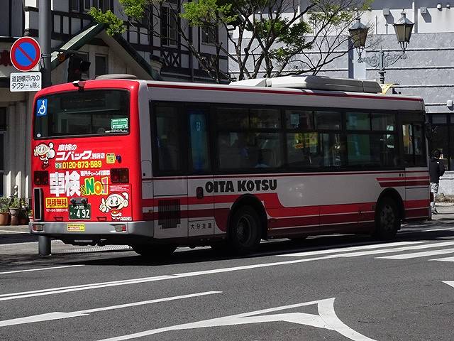 まずは04年に導入した西工ボディ架装の日野RJワンステップ車。画像の車両は2016年の大分交通創業120周年を記念し、別大電車をイメージしたデザインのラッピング車となっています。