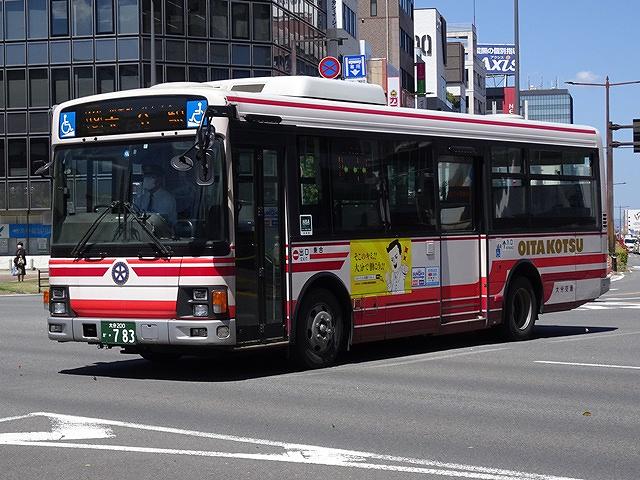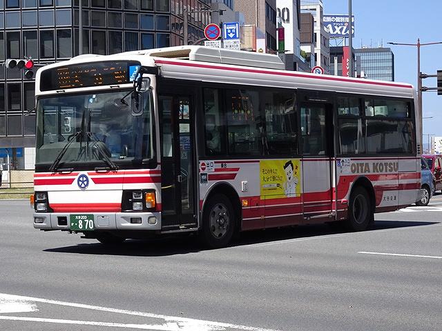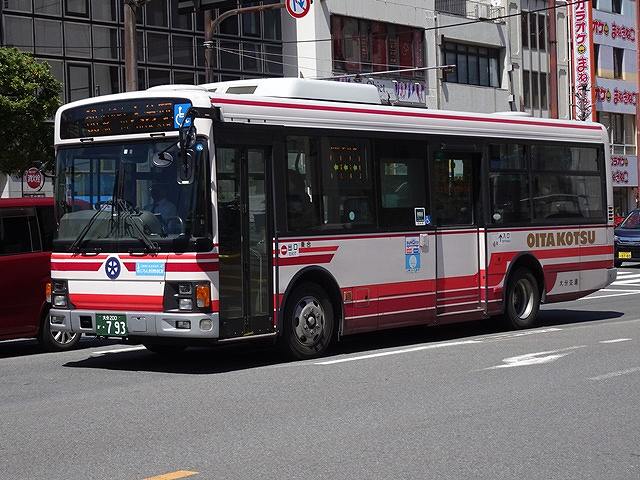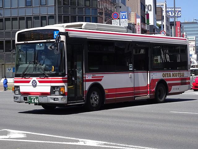 画像の車両は松戸新京成バスからの移籍車で、前面行先表示の両サイドにスロープ表示ありの車椅子ピクトグラムが特徴です。大分交通は側面行先表示位置の変更改造までは行わないようで、画像の車両の側面行先表示は松戸新京成バス時代と変わらず前中扉間に設置しています。