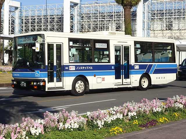ノンステップ車は大型・中型それぞれ1台導入。中型車はいちはやくノンステップ車モデルの販売を開始した西工ボディのRMを導入しました。大型車はフルフラットATな日野HUを導入しましたが、既に引退済み。不具合が多かったのか、宮崎交通では異例の速さで姿を消しました。
