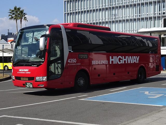 コーポレートカラーの赤色ベースに白色の文字表記という水戸岡氏によるデザインを採用するJR九州バス。都市間高速車には「HIGHWAY」表記が入ります。