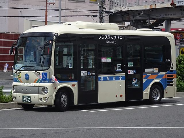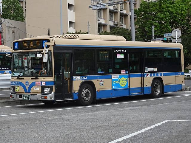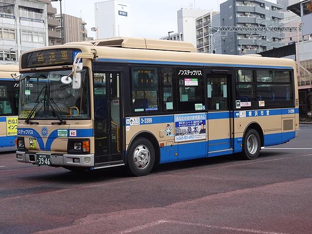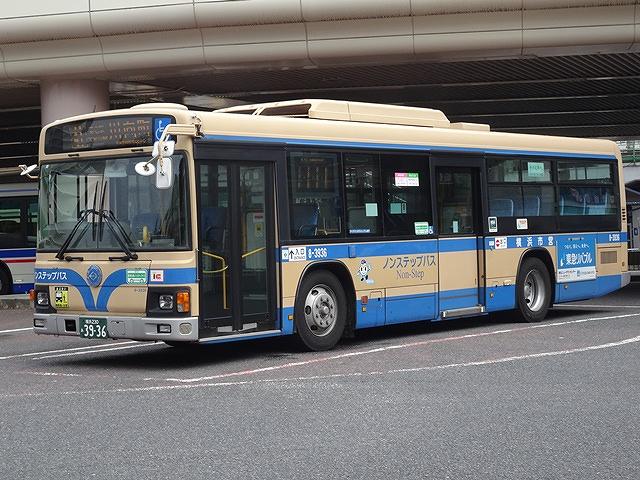 こちらは16年度導入の日野KV。横浜市交通局の局番は-(ハイフン)「後ろの4桁の千位がメーカー 」を表し、「3」は日野車となります。ちなみに滝頭営業所配置の一般乗合車両は正面に局番の4桁数字だけを追加して貼っているのが特徴です。