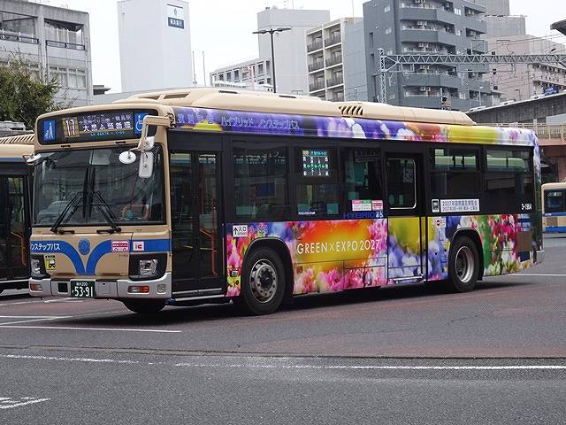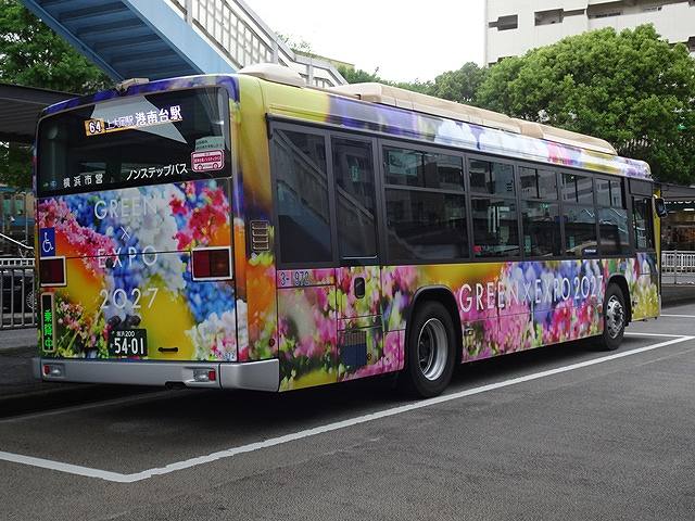 横浜市交通局は「低公害車としてツーステップ時代からハイブリッドバス・CNGバスを導入 」しており、現在は日野・いすゞのハイブリッドバスのほかトヨタの燃料電池バスも在籍しています。画像は2023年度に導入した日野ブルーリボンハイブリッドのOEM車となる、いすゞエルガハイブリッド。行先表示はカラーLED機を搭載しています。この年式の車両の多くは2027年に開催予定の国際園芸博覧会のラッピング車となっています。