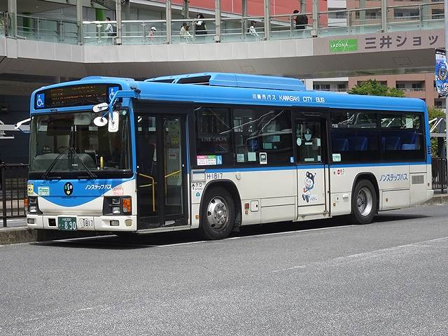 ごく普通のディーゼル車ももちろん在籍しています。2010年に導入した日野KVノンステップ車。営業所を表すアルファベット「H」は上平間営業所の配置車両です。