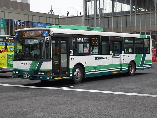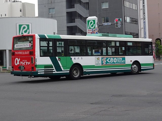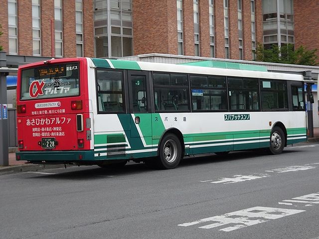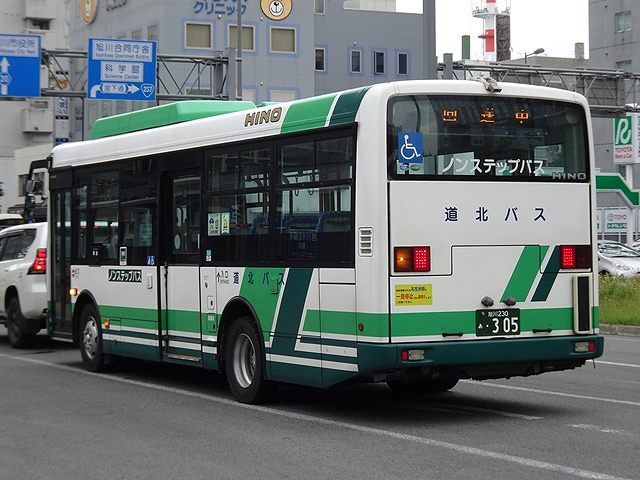 まずは、富士7Eボディで中扉折戸仕様のUAツーステップ長尺車。後面の行先表示は後付けしたのか、細長く見えるサイズのLED機を搭載しています。道北バスの一般乗合車で自社発注のツーステップ車はこの車両のみ、いつ代替対象となってもおかしくない古参車です。