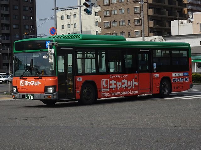 現行ボディにモデルチェンジした、いすゞLV長尺ノンステップ車で、窓下部分を全面ラッピングした広告車です。運転席側の中央側面窓はメーカー標準の固定窓仕様です。
