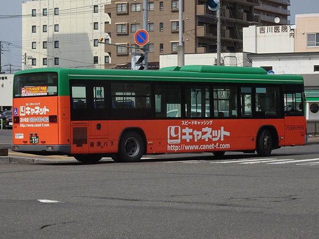 2017年に導入した、いすゞLV長尺ノンステップ車。現行ジェイ・バス製ボディのノンステップ車は通常後方の位置にある側面「DONAN BUS」ロゴが、前中扉間にあります。