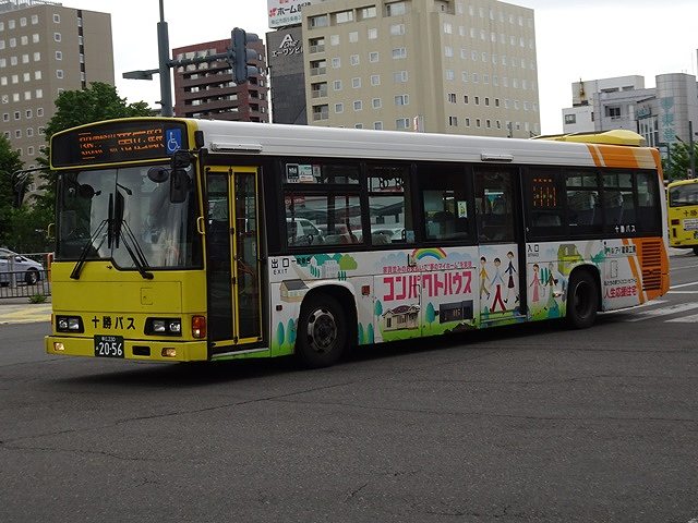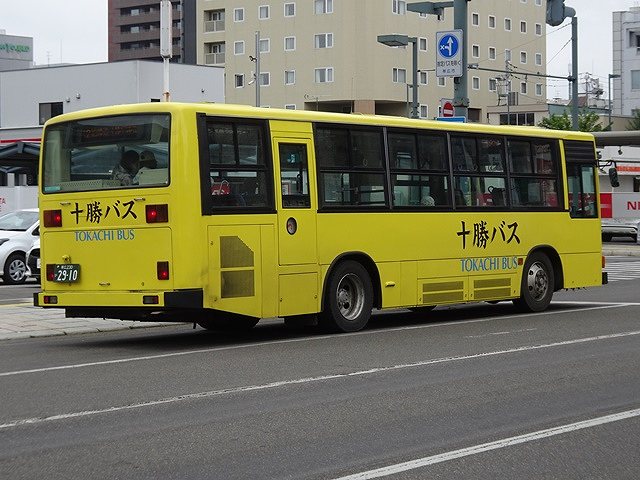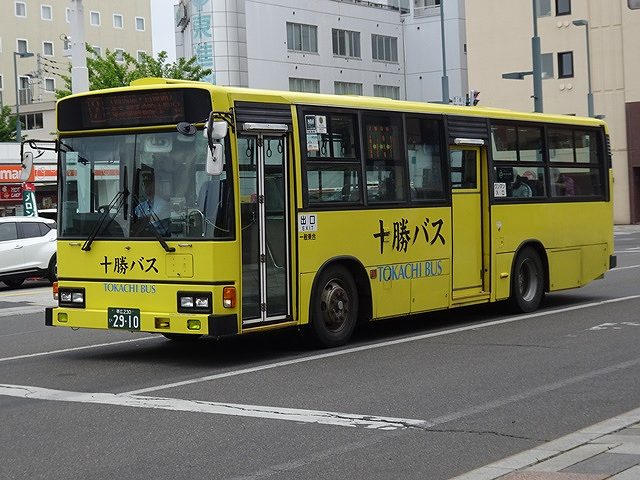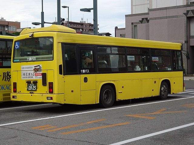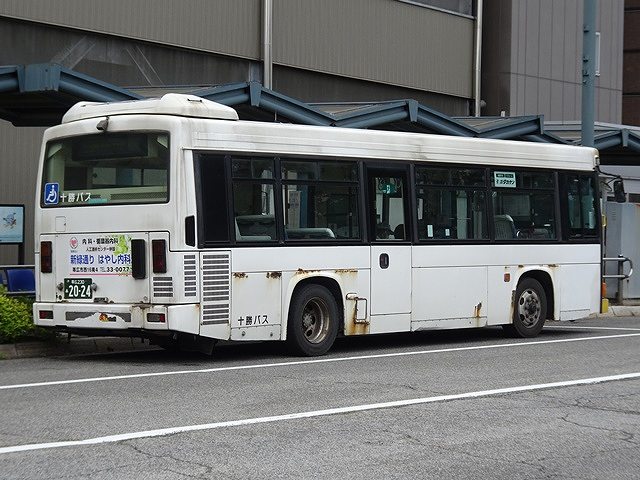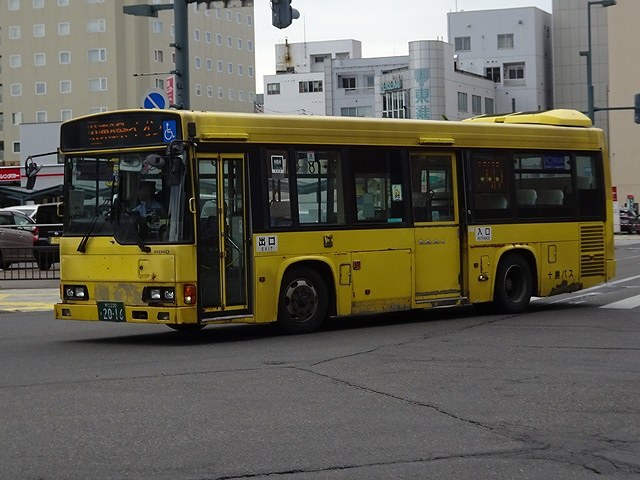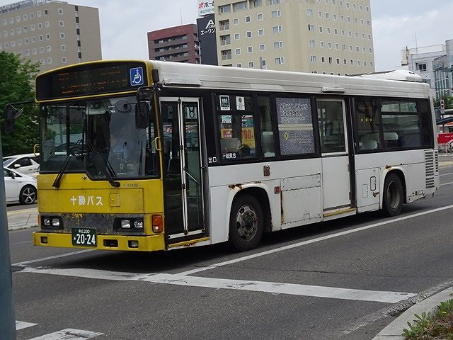 こちらの日野HUワンステップ車は川崎鶴見臨港バスからの移籍車。やはり中扉部に車椅子対応のスロープは装備していません。ボディ更新を行ったばかりのようで、現行の筆文字風「十勝バス」ロゴが貼られています。
