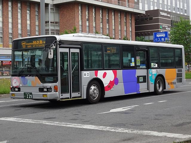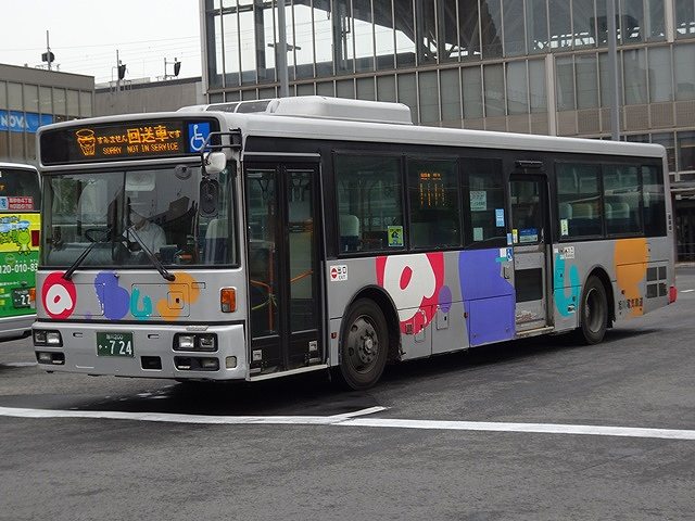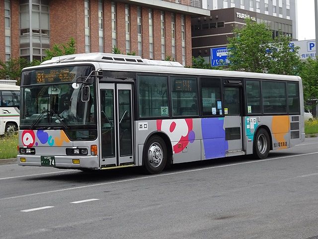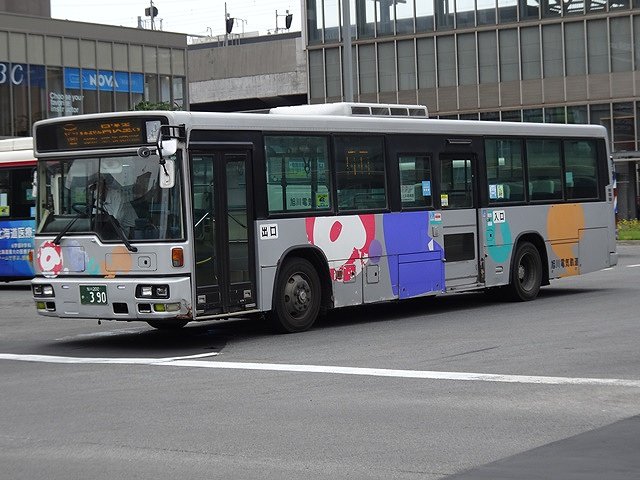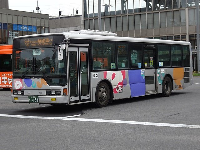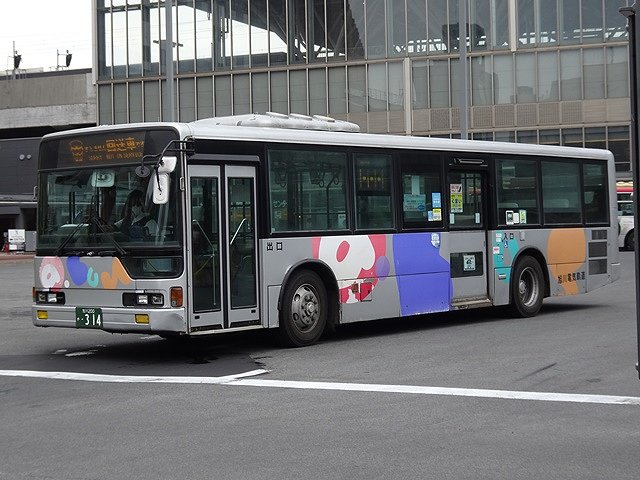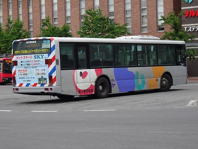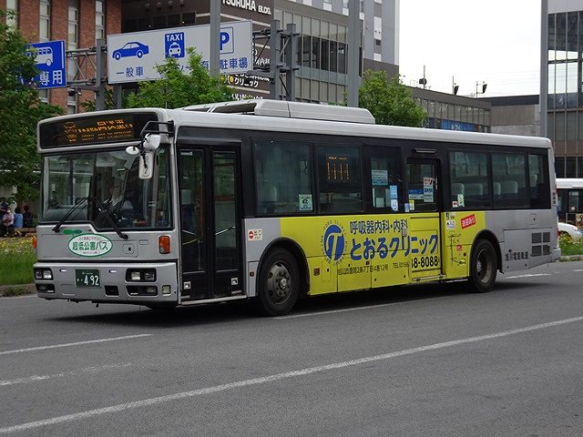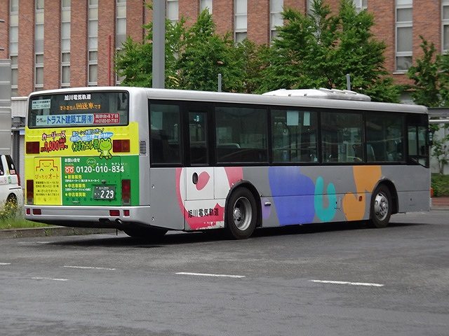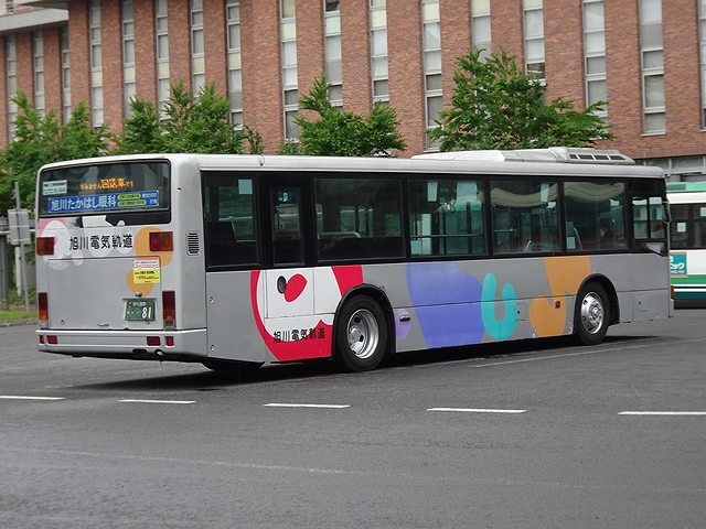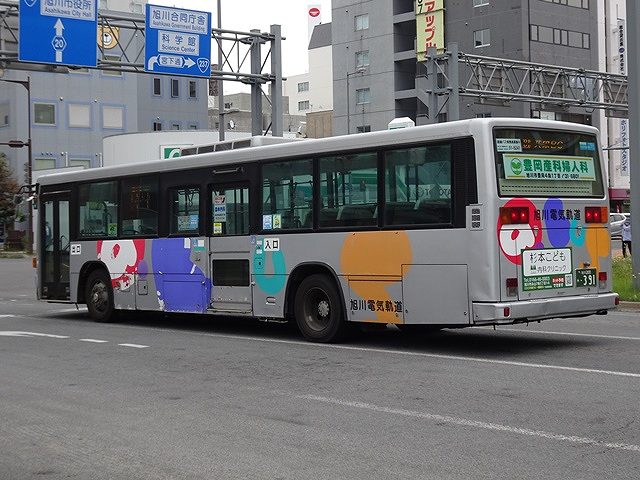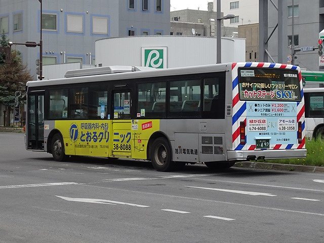 塗装は既存車と全く異なる銀地にカッティングシートを多用した「アーバス」デザインを採用し、以後旭川電気軌道のノンステップ車の標準となりました。1997年導入車は画像の1台を残すのみとなりましたが、この日はごく普通に運用に入っていました。