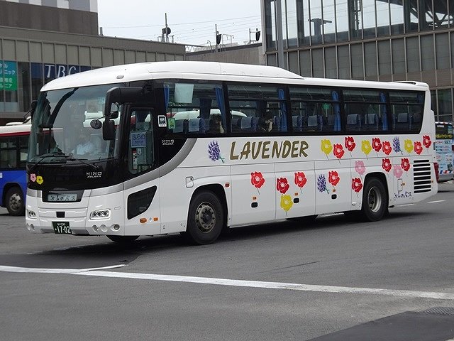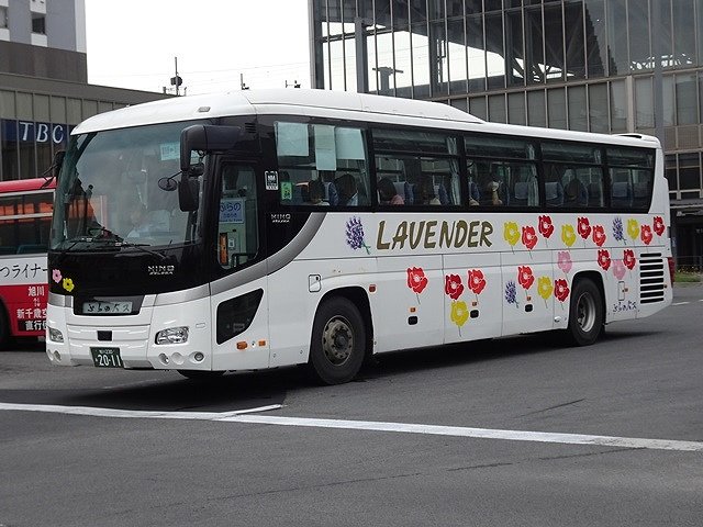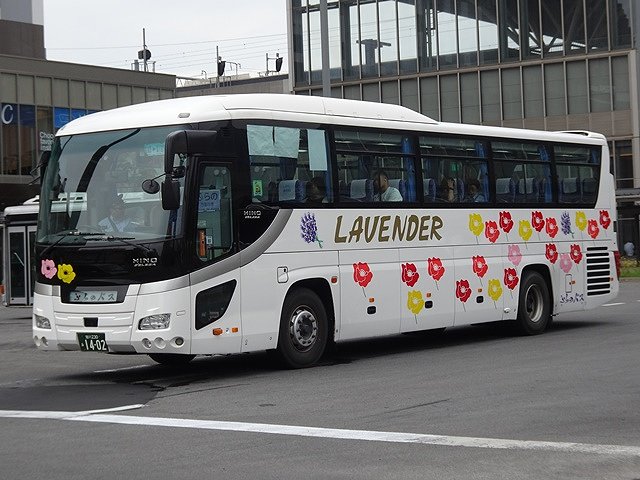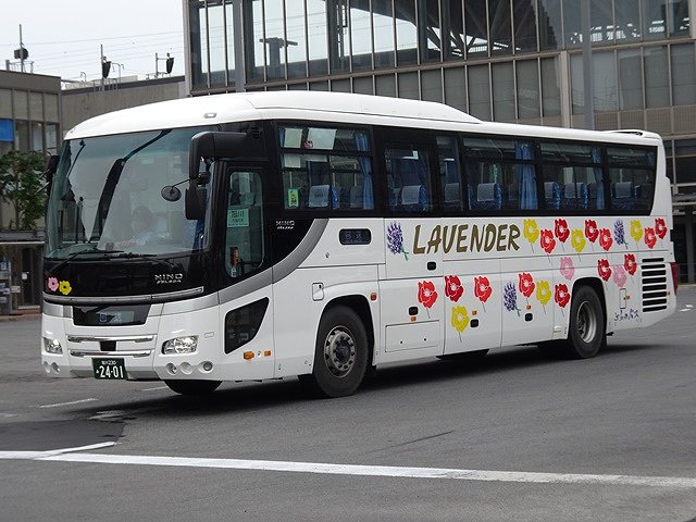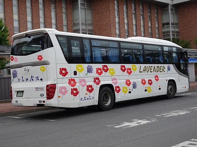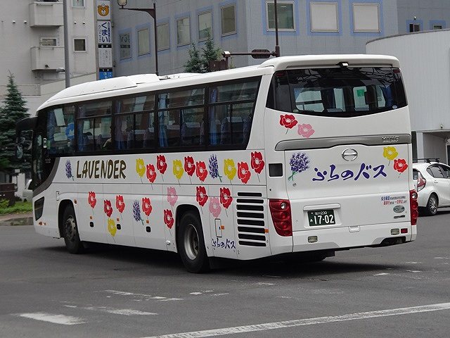この日はインバウンド旅行者の乗車が多く見込まれたからなのか、記録出来た「快速ラベンダー号」運用車両はハイデッカー車だけでした。まずは2011年に貸切車として導入した廉価グレードの日野セレガ。貸切車から「快速ラベンダー号」へ路線転用し、塗装はカラフルな花いっぱいの路線車カラーに塗り替えられています。ちなみに、ふらのバスの貸切車の塗装は旭川電気軌道と同じ白地に金銀色の雪の結晶を採用しています。