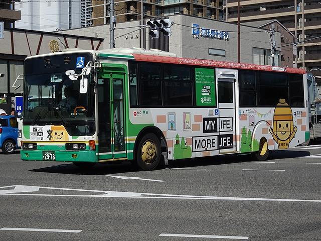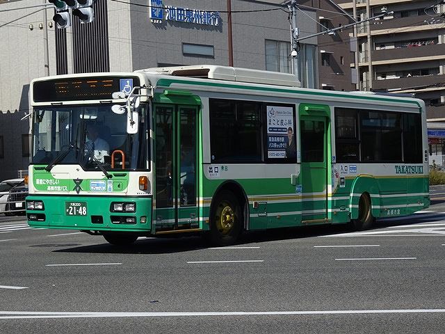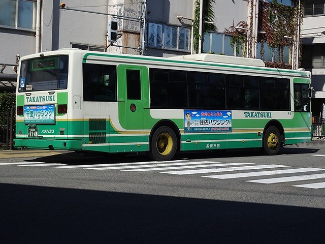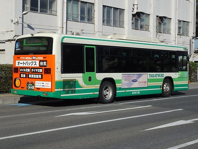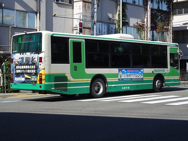 2010年は西日本車体製ボディ車だけでなく、OEM車となるAPワンステップ車も導入。公営バス事業者でAPを導入したのは高槻市交通部だけというレアな存在です。クーラーは高槻市交通部では珍しい三菱重工製を搭載しています。画像の車両のラッピングは高槻市への定住をPRしたもので、前面にもラッピングを施しています。