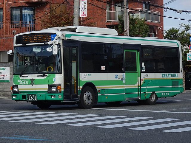 高槻市交通部は2010年のバスボディ製造終了まで西日本車体製ボディ架装車をメインに導入してきました。画像は古参格となった、2007年導入の西日本車体製ボディを架装したいすゞLVノンステップ車。2015年導入車までの塗装は、乗降扉を目立たせるようなU字形の黄緑色帯が特徴でした。