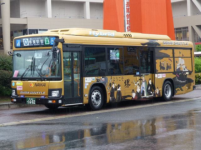 金色をベースに16世紀の堺における南蛮貿易をモチーフにしたイラストを描く 」デザインのブルーリボンハイブリッドで運行しています。「