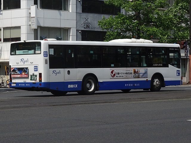 両備グループは2000年代以降水戸岡氏に様々なデザインを発注し、2003年から両備バスの一般路線車の塗装も氏によりリファインされました。氏のデザインらしくロゴなどを追加したほか、色調、裾部青色の塗りわけラインを前後どちらかのバンパー上辺にあわせるなどの変更が行われました。画像は2006年に導入したM尺ノンステップ車で、クーラーは三菱重工製を搭載しています。