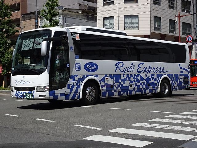 白に青のモザイク模様 」というデザインを採用しています。画像はこの日松山と岡山を結ぶ「マドンナエクスプレス号」の運用に入っていた2013年導入の三菱ふそうMSハイデッカー。側面窓は固定ガラス仕様です。
