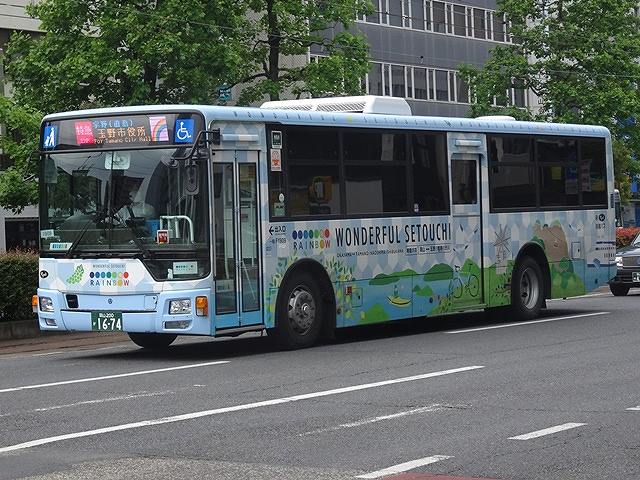 「玉野渋川特急」専用車では最新車となる2019年導入の長尺ワンステップ車。「
