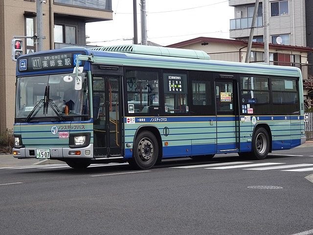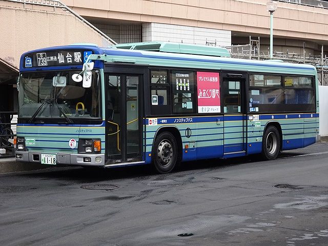 いすゞ販社が仙台市交通局の入札に本気を出し始め、2008年度以降の大型ディーゼルノンステップ車はほとんどいすゞ車となりました。画像は2011年度に導入したLKG規制車のいすゞLVノンステップ車で、前扉上の灯火が導入当初からの蛍光灯を装備しています。