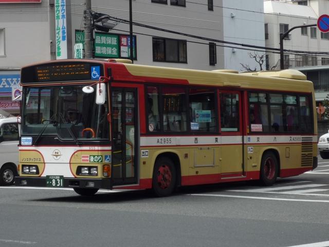 楢原営業所所属の中型車。リヤの広告掲示枠の関係で、社名表記がリヤガラス内