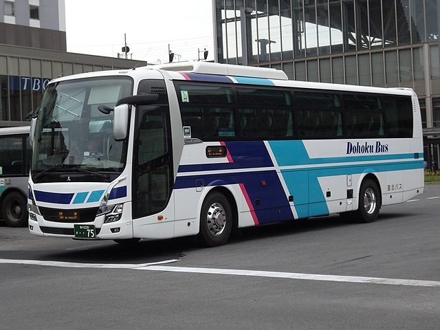 自社発注車では三菱ふそうエアロエースも在籍しています。4列シートのトイレ付車両で、ナンバープレートは道北バス創立75周年にちなんで「75」を取得しています。いわゆる令和顔のエアロエースで前面シグネチャーライトとメッキパーツを装備した力の入った1台です。